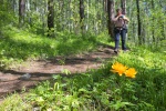 Stetig ging es nun bergauf. Birken, Kiefern und Lärchen waren die dominierenden Bäume des Waldes. Am Wegesrand blühten Жарки – gelbe Sibirische Trollblumen (Trollius ircuticus), violette Sibirische Schwertlilien (Iris sibirica) und Sibirische Akelei (Aquilegia caerulea).