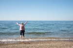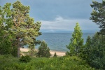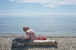 Bald ging es wieder hinunter ans Seeufer, diesmal auf einen Sandstrand. Anne konnte nicht widerstehen, zog ihre Schuhe aus und stellte sich bis zu den Knöcheln ins kalte Wasser.