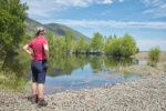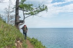 Der Weg hinter Bolschaja Kadilnaja war breit und gut ausgebaut. Am Seeufer zelteten mehrere Kajakfahrer. Wir hatten sie gestern Abend paddeln sehen. Nach einer knappen Stunde zweigt ein Pfad nach links zu einer Höhle ab. Wir folgten dem Hauptweg, der nun die nächsten 700 m direkt am Ufer entlangführte. Eigentlich ging es weglos am Ufer weiter, denn der Wanderweg, der etwas oberhalb parallel zum Berghang verlief, war auf diesem Abschnitt aufgrund von Erosionsschäden gesperrt. Das könnte nächste Woche unser Arbeitsplatz werden, überlegte ich mir.