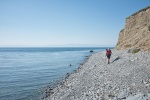 Nur wenige Minuten hinter dem Kap erwartete uns die Teufelsbrücke (Чёртов Мост). Der Weg wurde hier in einen steilen Konglomeratfelsen getrieben, an dessen Flanken Mongolenmöwen (Larus vegae mongolicus) nisteten. Provisorisch über einen Felsspalt gelegte Holzbalken gaben der Stelle ihren Namen. Warntafeln weisen darauf hin, dass es hier zu Steinschlag kommen kann und man sich nahe am Fels bewegen soll. Vorsicht walten lassen sollte man auch aufgrund des losen Gerölls auf der harten Oberfläche des Pfades. Das Zeug hat Eigenschaften eines Kugellagers…