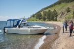 Von Nordosten her wehte ein kalter Wind, der so genannte Barguzin (Баргузин). Seinen Namen erhielt er vom Fluss Barguzin an der Ostseite des Baikalsees. Somit schien zwar die Sonne, doch es herrschte starker Wellengang auf dem Wasser. Kaum hatten wir die Bucht von Listwjanka verlassen hüpfte unser Boot auf und ab über den See. Nach 45 Minuten Baikal-Rodeo erreichten wir schließlich die Bucht am Kap Sobolew.