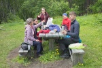 Anne und Natascha hatte es als erste mit dem Küchendienst erwischt. Da es am Morgen jedoch regnete verzögerte sich alles. Den übrigen Frühstücksbrei opferten wir nach alter Schamanen-Tradition im Lagerfeuer den Geistern. Mögen sie für besseres Wetter sorgen. Wir bekamen von Roman einen Vortrag über Arbeitsschutz und lernten die drei gefährlichsten Tiere der Taiga kennen – Bären, Schlangen und Zecken…
