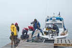 Der Barguzin wehte nicht, aber es regnete auch nicht. Unser Zelt hatte einen gelben Belag als wir es abbauten – Kiefernpollen. Als Dankeschön für unser Mitwirken gab es für jeden ein T-Shirt mit dem Logo der Organisation BBT. Das Boot kam pünktlich und die Wellen waren auch nicht so hoch wie bei der Hinfahrt. Dafür umhüllte uns kurz vor Listwjanka dichter Nebel. Hupend näherten wir uns dem Hafen.