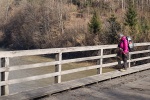 Am Morgen schneite es! Für unseren Frühstückskaffee kochten wir das Wasser draußen auf dem Gaskocher. In der Hütte war alles ruhig, wir packten und liefen los. Mittlerweile bahnten sich die Sonnenstrahlen ihren Weg durch die Baumwipfel. Wir folgten einem blau markierten Weg hinunter ins Tal des San. Je tiefer wir kamen, desto matschiger wurde es. Kurz bevor der Weg die Straße im San-Tal erreicht warnten Schilder den Wanderer vor der Gefahr durch Meister Petz. Eine Holzbrücke führte über den Fluss. Auf einer Geröllbank am Ufer angelte ein Mann. Das Ufer sah hier so aus wie im Wolfsfilm. Ob hier auch der Bär zu Besuch kommt? Wohl eher nicht. Der San führte viel Wasser, ein deutliches Zeichen für die beginnende Schneeschmelze.