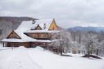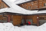 Der Wanderweg, nun im Wald verlaufend, änderte sich in einen schmalen Pfad, der steil bergauf führte. Bald stapften wir über Eis und Schnee. Der Schnee war hart, sodass wir auch ohne Schneeschuhe gut laufen konnten. Der Pfad mündete auf den Bergkamm, wo uns der Wind ordentlich um die Ohren blies. Nach über 2 Stunden tauchte zwischen den Bäumen das Dach der Berghütte auf. Die Hütte ist aus Holz, wie ich es oft in den polnischen Karpaten gesehen hatte.