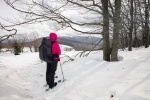 Der Wald weiter oben war dagegen sehr winterlich. Zwischen den schneebedeckten Bäumen sah ich eine Hirschkuh verschwinden. Am Boden stapften wir über Hirsch- und Wildschweinspuren. Der Weg war gut markiert, nur die vom Wind abgerissenen Äste am Boden gestalteten das Laufen etwas mühsam. Kurz vor dem Bergsattel hatten wir noch einmal tolle Sicht auf die beiden Rawka-Gipfel.