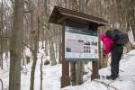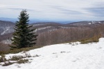 Dann erreichten wir die Wegkreuzung. Der schwarze Weg führte hinab ins Dorf Jabłonki, wir folgten dem blauen Band über den Bergkamm. Ab jetzt wurde die Orientierung schwieriger, immer wieder musste ich einen Blick auf mein GPS riskieren, um die Richtung zu finden. Auch die Schneedecke war nicht mehr konstant. Auf dem Kamm lag teilweise gar kein Schnee mehr, in den Senken dagegen so viel, dass wir bis zu den Knien einsackten. Ständig mussten wir die Schneeschuhe an und wieder abschnallen. Mit dem Gipfel des Durna (979 m) erreichten wir den letzten Höhepunkt der Wanderung.