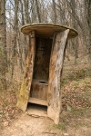 Anne packte derweil die Arbeitswut, indem sie sich voll Enthusiasmus dem Holzhacken widmete. Ich schaute mich etwas in der Gegend um. Ein Holzschild an der Grundstücksgrenze verriet mir, dass ich mich in der „Republik des freien Denkens“ befand. Am Horizont erhoben sich die Berge der Hochbieszczady im Abendlicht – schneebedeckt. Und ein Hüttchen auf Schienen diente offenbar als Beobachtungsposten für Wildtiere.