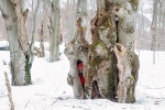 Wir machten ein „wir-sind-dagewesen-Foto“ und traten den Rückweg an. Vom Gipfel der Wielka Rawka bot sich eine herrliche Sicht auf die Berge der Waldkarpaten. Bewaldete Hügelketten zogen sich bis zum Horizont. Auch ohne Laub fand ich die Szenerie beeindruckend. Direkt vor uns waren die Bäumchen gebogen, ihre Spitzen steckten fest im Schnee. Steil führte der Wanderweg nun hinab erst zum Gipfel Mała Rawka (1272 m) und dann bis zur Berghütte.