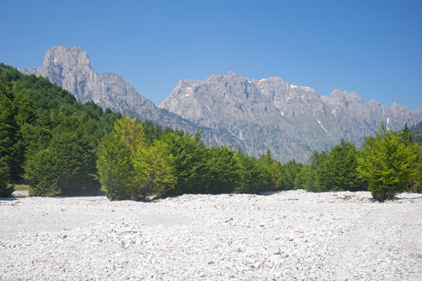 Kreideweißes Geröll im Valbonatal, darüber der Gipfel des Maja e Thatё (2406m).