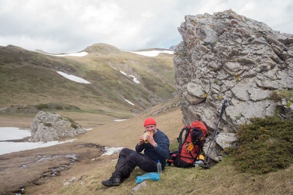 Mittagspause auf der ersten Etappe des POB, zwischen Schneeresten und Krokussen. Trinkwasserprobleme gab es auf der gesamten Wanderung keine.