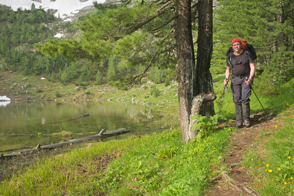 Der Pfad schlängelte sich noch ein Stück am Berghang entlang, dann waren Pfeile und Weg verschwunden. Am Horizont ragten die kahlen Kalkfelsen des Kollata e Keqe-Massivs in die Wolken. Auf dem Berghang vor mir glaubte ich so was wie einen Weg zu erkennen, der sich in einen Pass zog. Ich hielt darauf zu – querfeldein. Unter mir erschienen zwei kleine Bergseen und auf dem Kamm sogar eine Markierung – weißer Punkt auf rotem Grund. Ich war wieder auf dem POB! Am Ziel war ich aber noch nicht. Bald verschwand der Pfad im Schnee und blieb auch verschwunden. Dafür tauchten wieder violette Krokusteppiche vor mir auf. Unter mir rotteten die Reste einer Hirtenhütte vor sich hin. Die Hirten sind sicher nicht hier hoch geflogen, also muss es auch einen Weg geben! Ein kurzes Schnee- und Krokustrampling und ich stand wieder auf einem Pfad.