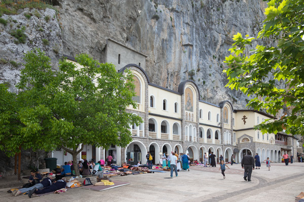 Auf dem Platz vor dem Kloster lagen Matten und auf den Matten Menschen, Pilger die es sich zur Aufgabe gemacht hatten, dem Heiligen Vasilije, seines Zeichens Klostergründer, einen Besuch abzustatten. Das Kloster ist für serbisch-orthodoxe Christen ein wichtiger Wallfahrtsort. Die in den Fels gebaute Kirche erinnerte mich an das Felsenkloster Wardzia in Georgien.